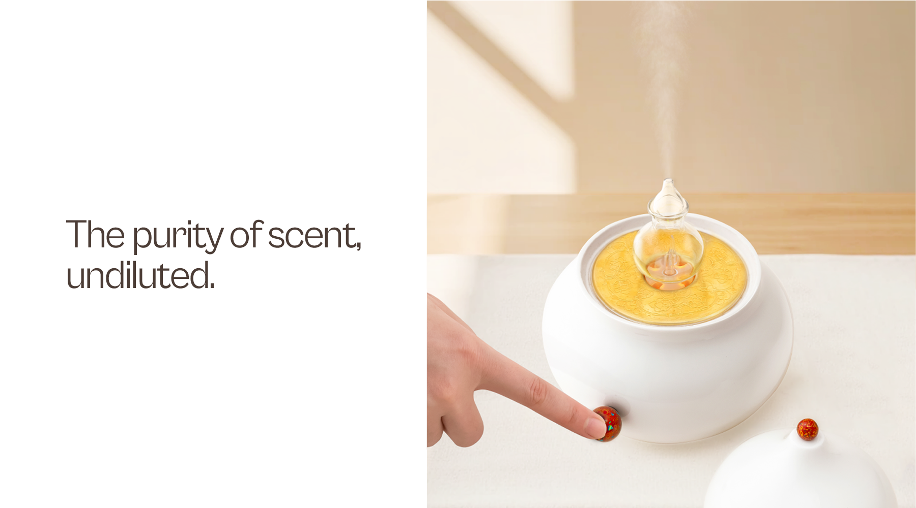The hand-lacquered control knob features traditional Chinese lacquerware craftsmanship, layered over solid rosewood and naturally cured over 40 days. Each touch reveals a story of time, patience, and artistry — a rare fusion of heritage luxury and touch-control diffuser innovation.